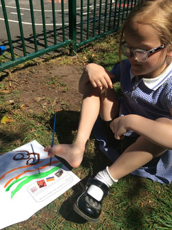 We explored resilience and creativity by painting only with our feet—inspired by Christy Brown, who had cerebral palsy and used his left foot to create his artwork.